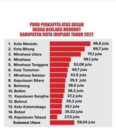 Untuk provinsi Sulawesi Utara sendiri income per kapita 59,04 juta. Atau sekitar Rp4,9 juta per bulan rata-rata pendapatan setiap kepala keluarga.