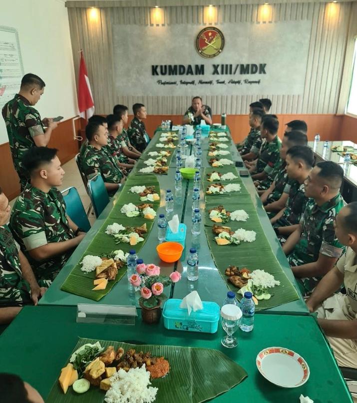 Usai acara tradisi, para prajurit Kumdam XIII/Mdk melanjutkan dengan makan bersama dengan nasi dan lauk diletakkan diatas daun pisang.