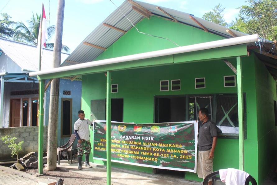 MANADO Nusantaraline.com – Program TNI Manunggal Membangun Desa (TMMD) ke-125 yang dilaksanakan oleh Kodim 1309/Manado di Kelurahan Bengkol, Kecamatan Mapanget, Kota Manado, terus menunjukkan progres signifikan. Hingga saat ini, dua unit Rumah Tidak Layak Huni (RTLH) yang menjadi salah satu sasaran fisik TMMD telah selesai 100 persen, Selasa (12/8/2025).